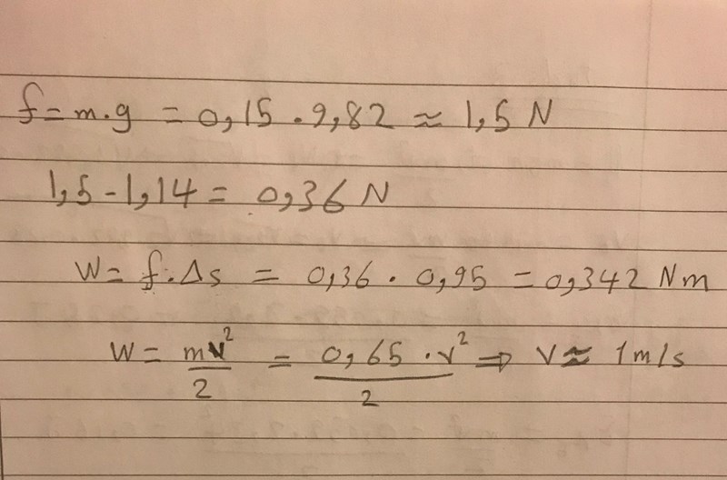 Jag fick att kraften är snöret = 0,15*9,82 = 1,5N. och jag försökte sedan att använda mig av formeln för att bestämma hastigheten, men jag måste också bestämma accelerationen och tiden. Hur ska jag göra det utan att använda mig av energiprincipen för att den här uppgiften handlar bara om kraft och hastighet. Jag har friktionskraft som är 1,14N.