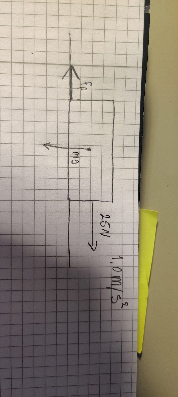 "En låda med massan 15 kg dras över ett golv med hjälp av ett rep. När dragkraften från repet är 25 N accelererar lådan med 1,0 m/s². Bestäm friktionskoefficienten mellan lådan och golvet."