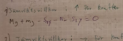 Jaa asså jag är dock lite förvirrad över min jämvikt som inkluderar plankan också. Jag antar att jag får skriva en text om varför jag inte tar med S2y och S2x för att lösa ut my ur Fmy ekvationen. Allt kretsar ju kring klossen