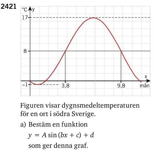 Har dock väldigt svårt att hitta b, försökte att hitta b då y(3,8) = 8 innebär att sin x = 0. Det leder till att sin(3,8b - 3,8) = 0. (b = 1) Men detta är inte rätt enligt facit, som ger 9 sin (0,524x - 2,0) + 8. (Ledtråd i facit ger: 9 sin(pi/6(x - 3,8))