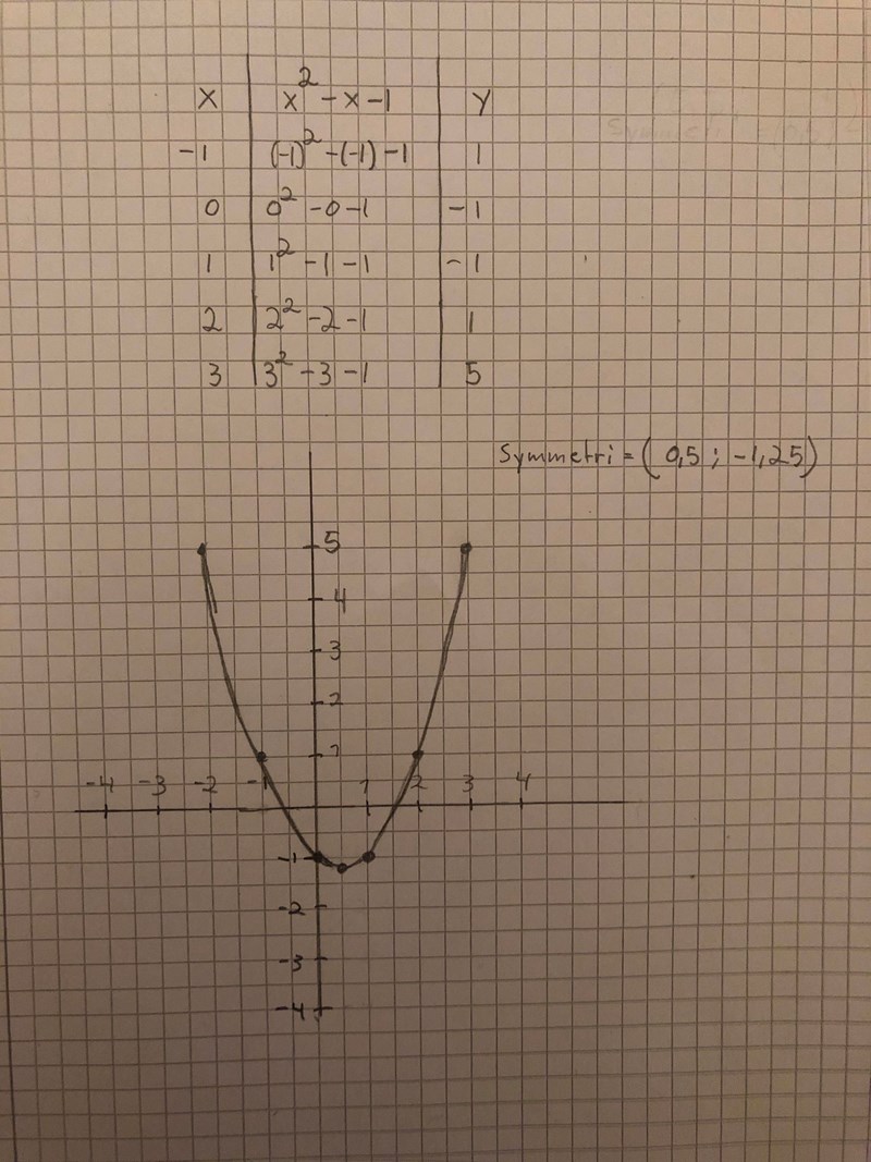 Jag har ritat in symmetrilinjen x = 0,5 som en vertikall blå linje och en ungefärlig bild av parabeln. Jag har med rött markerat att f(-1) = f(2) och tydliggjort att dessa punkter ligger på var sin sida om och på samma avstånd från symmetrilinjen.