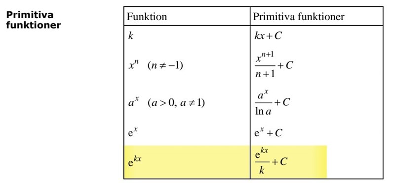 Du kan nu använda den gulmarkerade raden i formelsamlingens tabell för att få fram att de primitiva funktionerna är f(x) = A*ekx/k+C