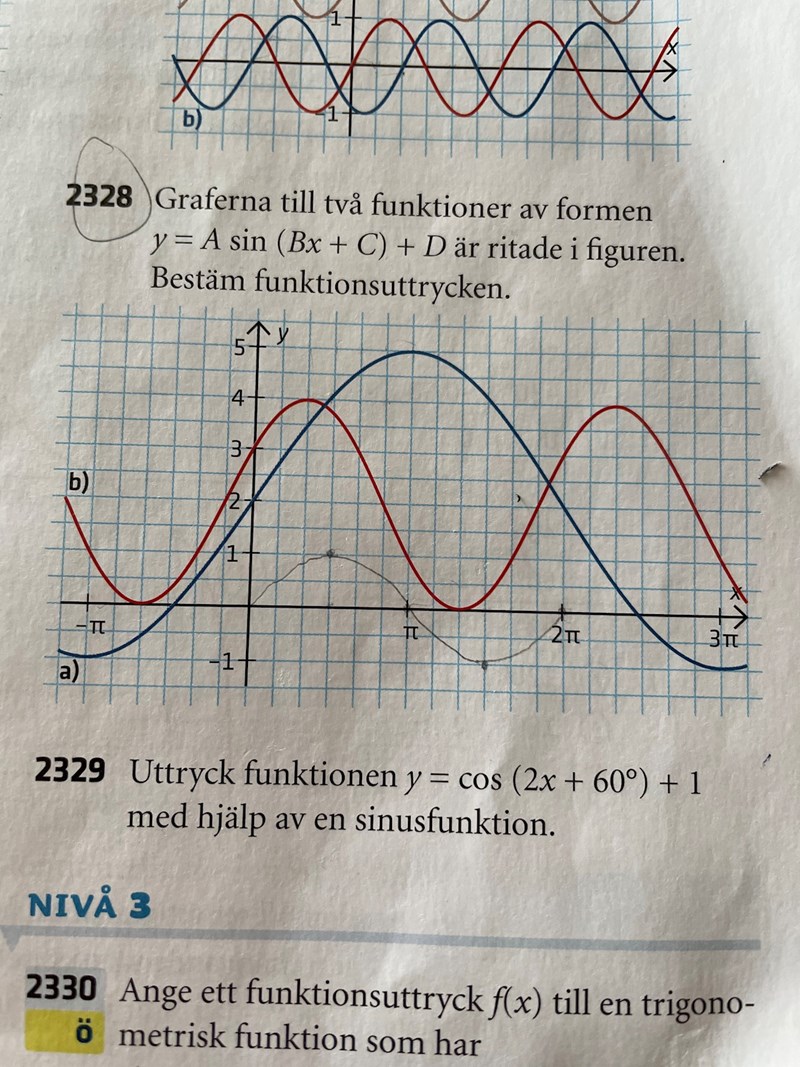 Jag tycker att det är lätt att bestämma A, B och D, men hur gör man för att få fram C (alltså förskjutningen i x-led)? Har försökt att förstå hur man ska avläsa denna förskjutning men fattar inget från boken. För att säga att en graf är förskjuten x antal radianer åt höger eller vänster så måste man väl utgå från en referensfunktion? Skulle någon kunna ge en utförlig förklaring till detta som kan appliceras på alla uppgifter av den här typen?