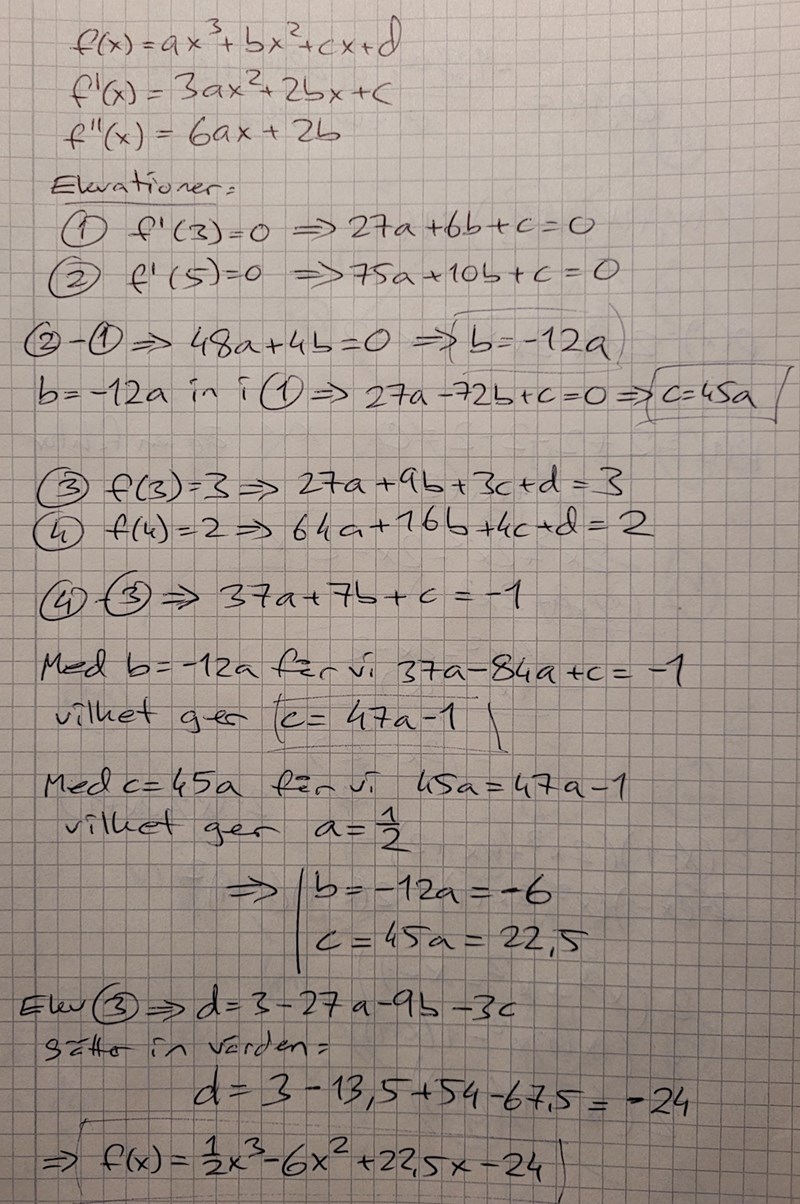 Du tänker rätt när du tar fram f'(x) och f''(x) och sedan löser ekvationerna f'(3) = 0, f'(5) = 0 och f''(4) = 0.