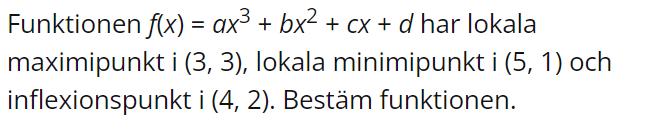 Jag har lurat dig att tro att f''(4) = 0 går att använda på det sätt du gör. Problemet är att den inte tillför mer information än de båda f'(3) = 0 och f'(5) = 0 gör tillsammans.