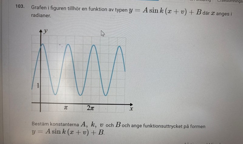Hej, jag har försökt lösa uppgiften men är lite osäker om jag har löst den på rätt sätt. Jag har fått svaret y=1,5sin2(x+45)+2, jag kom fram till detta svar genom att kolla på figuren bara, däremot är det här en A-uppgift och man kan inte se några exakta x-värden så jag undrar om man ska lösa den på ett annat sätt fast än svaret kanske är rätt.