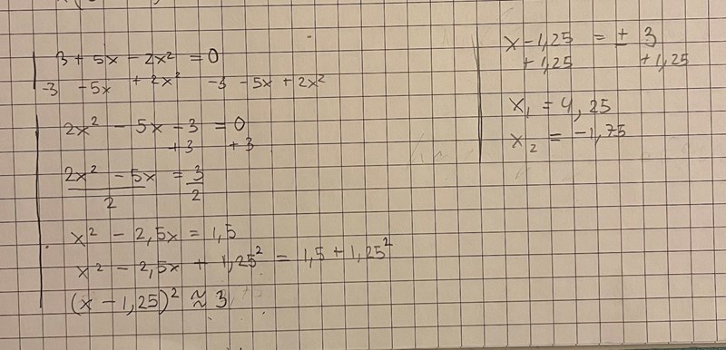 Jag håller på att lösa uppgift ”b)” som du kan se nedan. Jag försökte lösa den genom kvadratkomplettering eftersom att jag såg att man kunde lösa den med PQ-formeln och då borde man ju även kunna lösa den med kvadratkomplettering. Men någonting verkar vara fel på min metod då jag har fått fel svar…Jag skulle verkligen uppskatta om någon kan förklara vart i uträkningen felet ligger? Tack på förhand! (Nedan ser du även min uträkning)