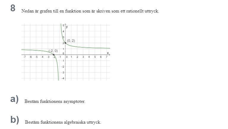 Såhär tänker jag. ty x=-1 är odefinierat, blir nämnaren 0 då x=-1. Alltså antar jag att nämnaren är 1+x. För att få asymptoten y=1 går funktionens värde mot 1 då x går mot oändligheten. Då vi låter x gå mot oändligheten i nämnaren (1+x) blir nämnaren så gott som oändligheten eftersom 1an inte spelar någon roll. för att x/x = 1 måste dessa vara samma. Därför antar jag att funktionens algebraiska uttryck är (-x)/(1+x)