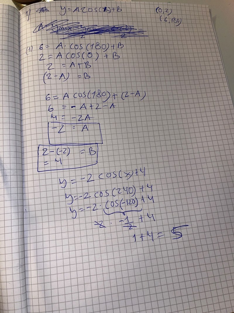 Grafen till y=A cos(x) + B skär y-axeln i y=2 och antar sitt största värde y= 6 för x=180. Bestäm funktionsvärde då x=240?