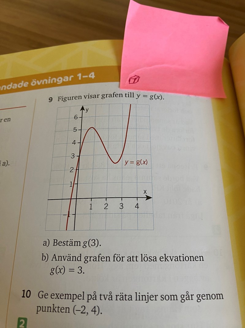 Börja där det står 3 på y-axeln, ta den vågräta linje som går där och se var den skär kurvan. Det är på flera ställen. Följ den lodräta linjen så att du ser på x-axeln vad det är för x-värde.