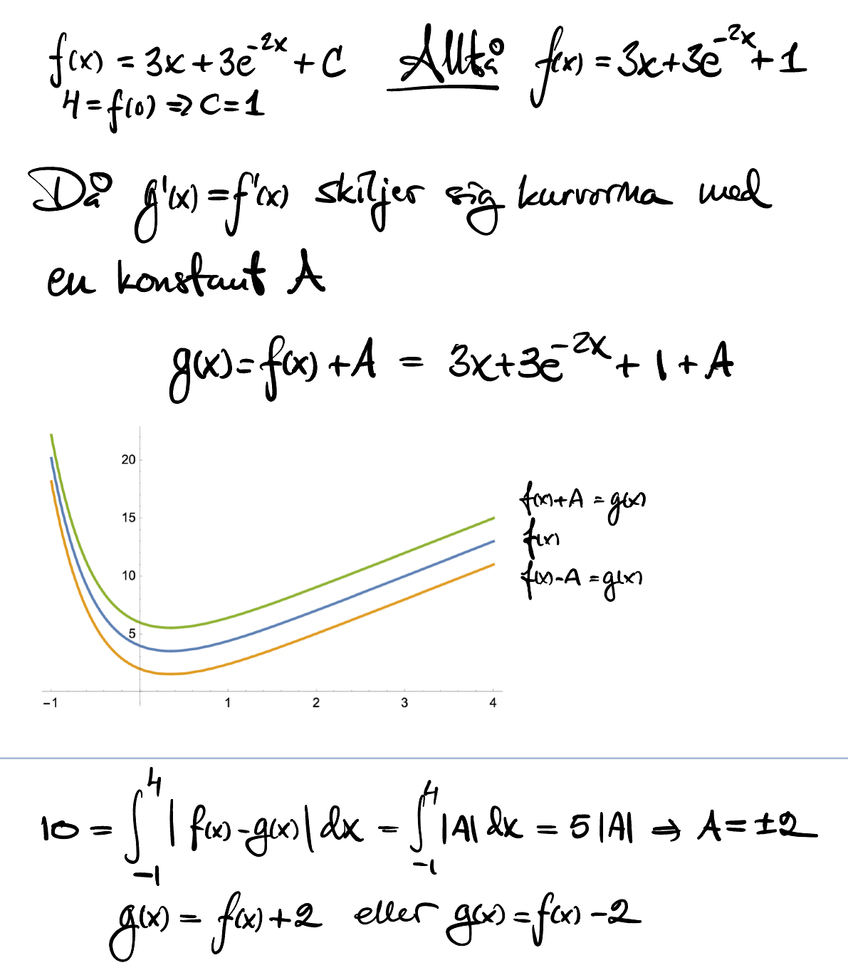 Jag har fått fram f(x)=3x+3e-2x+1 och jag fattar att man ska ta integralen(den ena minus den andra) från -1 till 4.