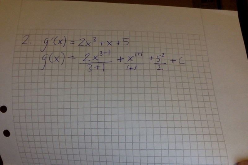 Bestäm g(x) om du vet att funktionen går igenom origo och att g´(x)=2x^3+x+5