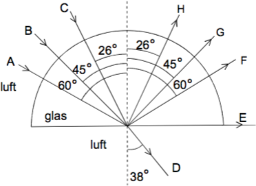 Frågan är vilken av de infallande strålarna A, B och C som kan ge upphov till strålen D. Det är endast en av dem som kan det. För övriga gäller totalreflektion, så en av F, G, H finns inte.