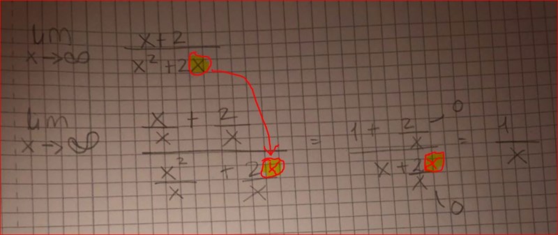 Nu kan du välja att antingen låta x gå mot oändligheten och konstatera att uttrycket då går mot 0 eller att först förkorta med x igen innan du låter x gå mot oändligheten.