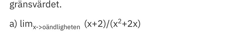 (1)/(x+2) . Jag kan välja att dividera alla uttryck med x för att jag tycker att det blir enklare att se att gränsvärdet går mot 0.