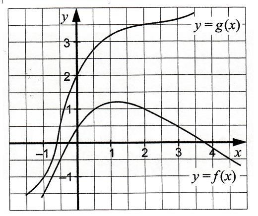 Här ser vi en bild på två funktioner i en graf; y= f(x) och y= g(x). Frågan lyder: