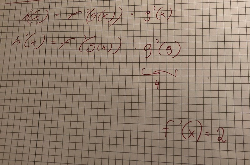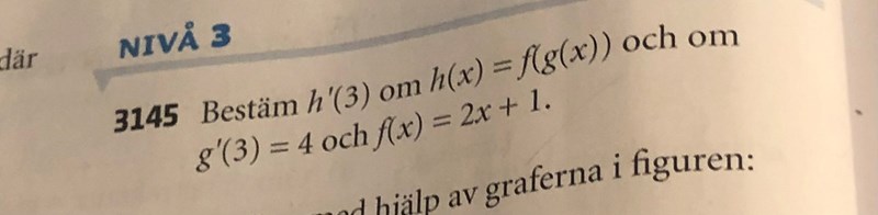 Den första faktorn får jag problem med. Jag vet att derivatan av f’(x) är 2. Men vad händer med g(3) inuti då?