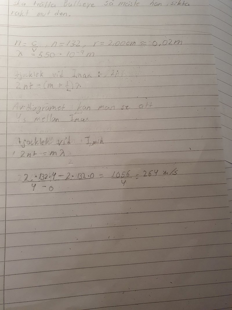 Na5a skrev:jag tolkar det som konstruktiv interferens, och jag vet att det är 4s mellan de. Formeln är 2*n*t.