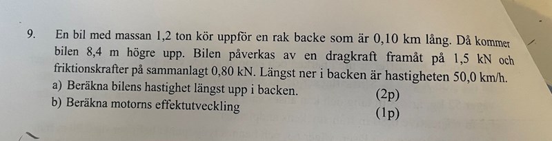 Eftersom hastigheten v = 0m/s när bilen stannar så vet vi att bilen endast har lägesenergi mgh i den punkt där den står stilla. Då får vi ekvationen