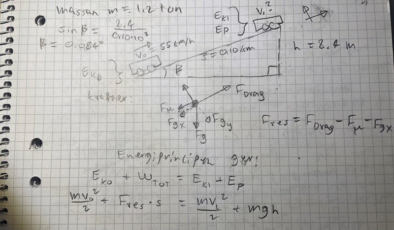 där h är den sökta höjden. Planets lutning samt höjden h kan (med hjälp av lite trigonometri) användas för att beräkna sträckan (hypotenusan) som bilen klarar att åka upp
