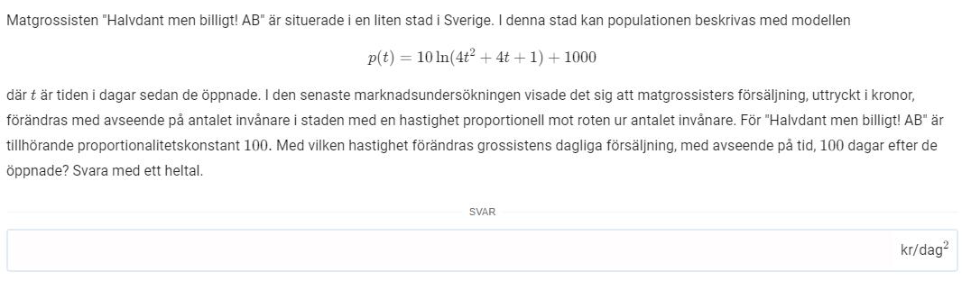 Matgrossisten "Halvdant men billigt! AB" är situerade i en liten stad i Sverige. I denna stad kan populationen beskrivas med modellen p(t)=10ln(4t2+4t+1)+1000