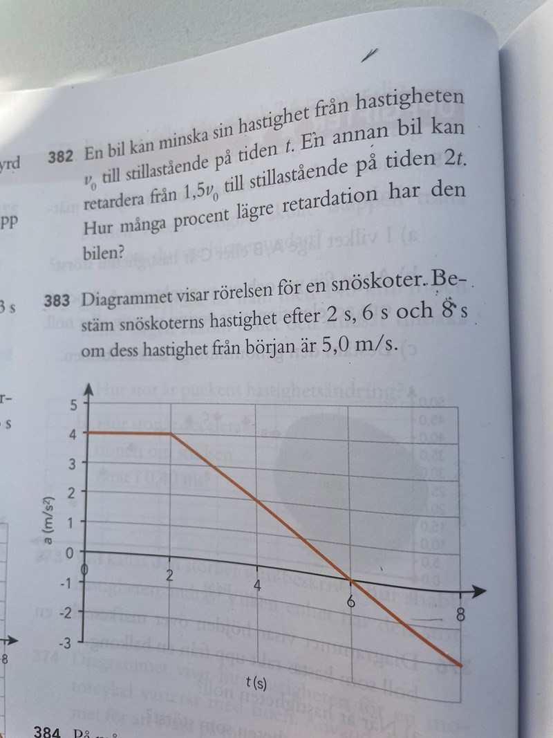 Jag behöver hjälp med uppgift 383. Jag använder mig av formeln V=V0+at och får fram hastigheten efter 2 sekunder. Sedan fastnar jag. Jag tänker att den nya starthastigheten borde bli den efter 2 sekunder men eftersom a=0 vid tidpunkten 6s får jag inte fram rätt svar