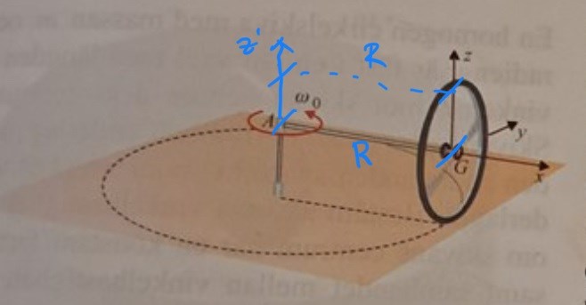 Antingen så tittar man på systemet som full rotation kring A. Men då behövs som du skriver tröghetsmatrisen map A. Lättare är kanske att kolla på rmm:s translation och rotationskomponent för sig. Oavsett är det viktigt att inse att hjulets masscentrum rör sig med hastigheten ω0\omega_0.