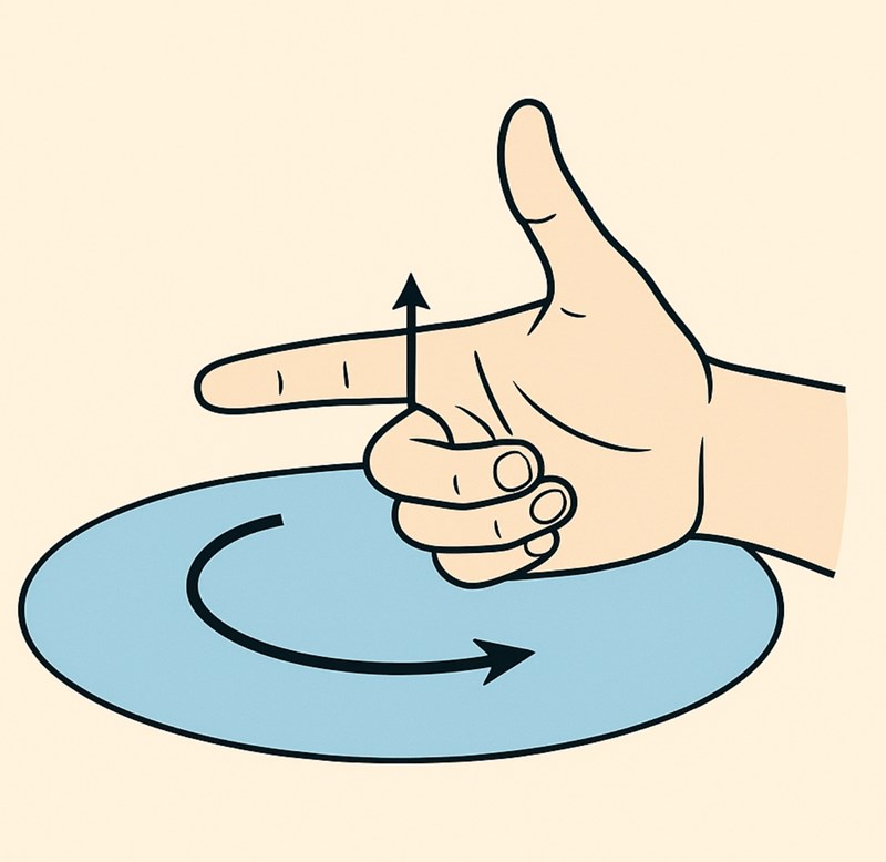 Hur bestämmer man kring vilken axel den snurrar runt? Är det via högerhandsregeln?