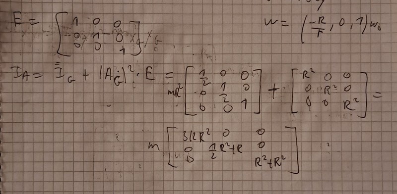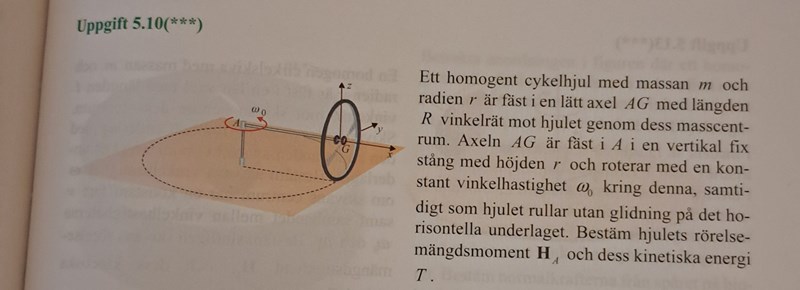 Jag började med att bestämma tensormatrisen och tänkte bestämma rörelsemängdsmomentet men fastnade i hur jag ska bestämma komponenter för vinkelhastigheten eftersom cykelhjulet har inte en vinkelhastighet som den roterar med. Sen ska vi ju ha tröghetsmoment map A och vet ej hur jag ska hitta det mha parallellförlfyttningssatsen. Hur tar man fram kroppens vinkelhastighet?