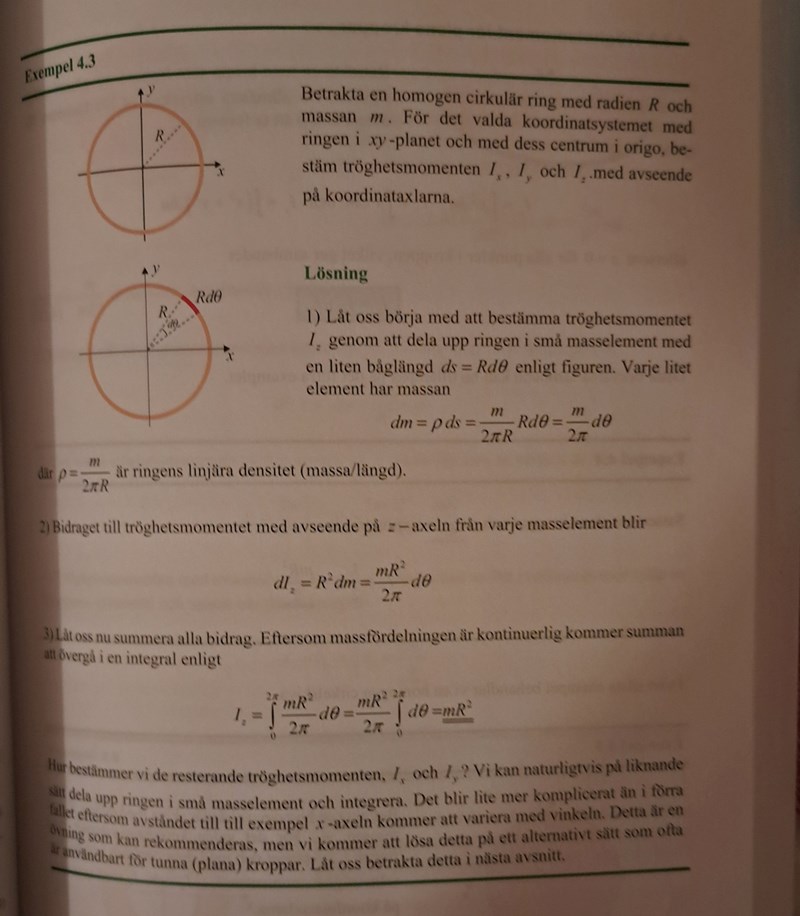 ja det är just hur jag ska använda koordinatsystemet som ställer till. Hur kommer man på att hjulet snurrar till x-axeln? Jag kan typ ej se detta framför mig. Jag förstår att uppgiften gav oss ett koordinatsystem som vi använder men det är just hur man ska tänka med tröghetsmoment som jag fastnar över eftersom i bokens bild har de ett xy-plan och då räknar de ut Iz som mR^2. Tröghetskomponenterna verkar typ byta plats beroende på vilket koordinatsystem man tittar på. Här kanske jag inte riktigt ser att snurrande är kring x-axeln som du visar med pilen. Jag tänkte att hjulet måste snurrar kring z-axeln såsom den ser ut , men i din röda pil medurs så snurrar den även från z axeln till x-axeln." Hjulet ligger alltså "platt" i yz-planet. Här hoppas jag att man ser att hjulet snurrar (den röda pilens riktning) medurs sett från spetsen av x-axeln" här ser jag inte att hjulet ligger platt i yz-planet samt att den snurrar från spetsen. Kan du förtydliga hur du ser detta?