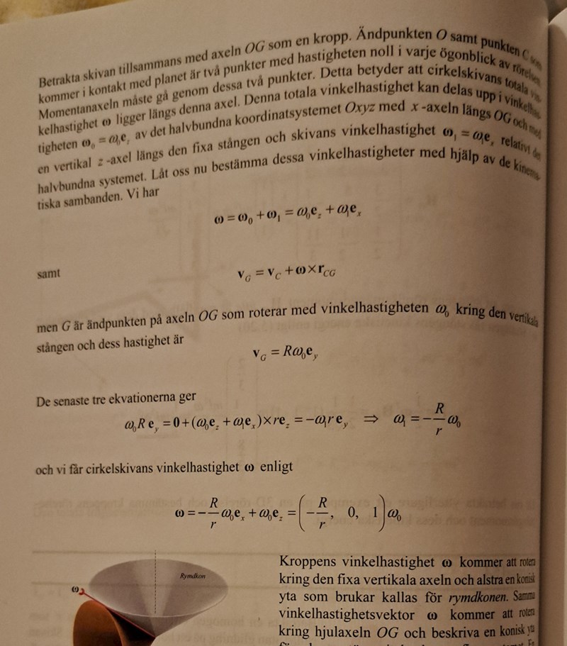 Hm jag ser inte hur hjulets vinkelhastighet saknar y -komponent. Försökte hänga med i ditt uttryck med v_g men sen tappade jag bort dig där vid no slip villkor. Boken gjorde ungefär såhär också med en liknande exempel.