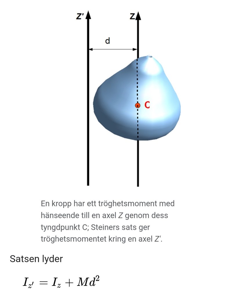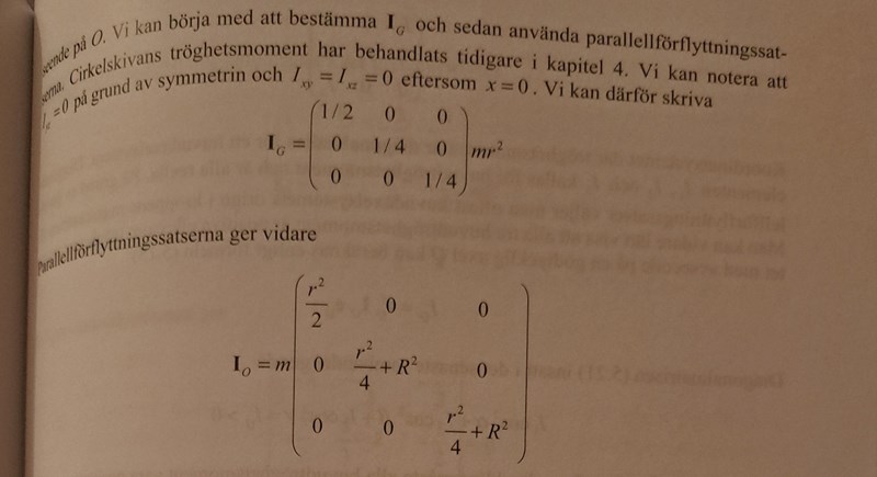 Ja asså jag är med på vad Ihar för komponenter på diagonalen. Det är inte det jag stör mig på. Det är mer hur man ska tänka för att få de här bidrag för IA mha parallellförflyttningssatsen såsom Daniel har fått fram i #22. Jag kan se att i z-led från z till z' axeln så blir Izz,A= m(R2+r2)/2 ,men jag vet ej hur man ska resonera för yy och xx komponent visuellt.