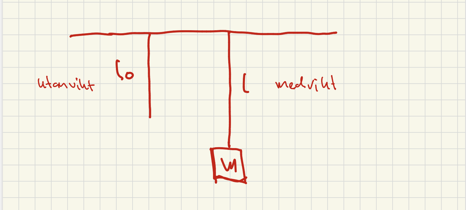 Om du bara låter linan hänga fritt utan någon vikt så har den längden l0. l är längden på linan i bottenläget då vi har en massa m fäst i linans ände.