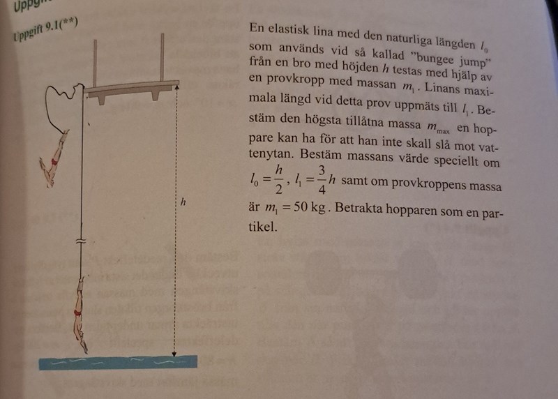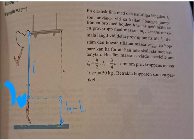 Vill du visa med en lämplig figur var du får dina energier ifrån samt l-l0? Jag kan tänka mig att från bro till vatten så är höjden h och då är hans begynnelsehastighet 0 och h0=0 och då är hans lägesenergi E=mgh eftersom han startar med vtopp=0