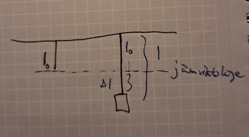 Okej den där längden l och l0 ser jag inte var i figuren du menar att de ska liksom stå så jag har i princip missuppfattat det här. Du visade tydligt var L var men inte l0 och jag kan inte bara acceptera att vi har någon l0(trådens förlängning) utan att jag ser var den är.