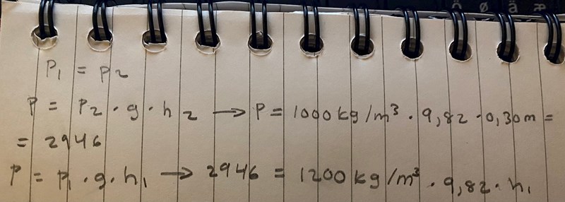 Hela lösningen bygger på att trycket på en viss höjd är detsamma i de 2 skänklarna i U-röret. Lösningen blir ännu tydligare om du ritar en figur och markerar var de 2 trycken finns. De tryck som du sätter lika för att lösa uppgiften. Om det är svårt att skriva p och så att man ser skillnad så kan du byta bokstav för en av dem.