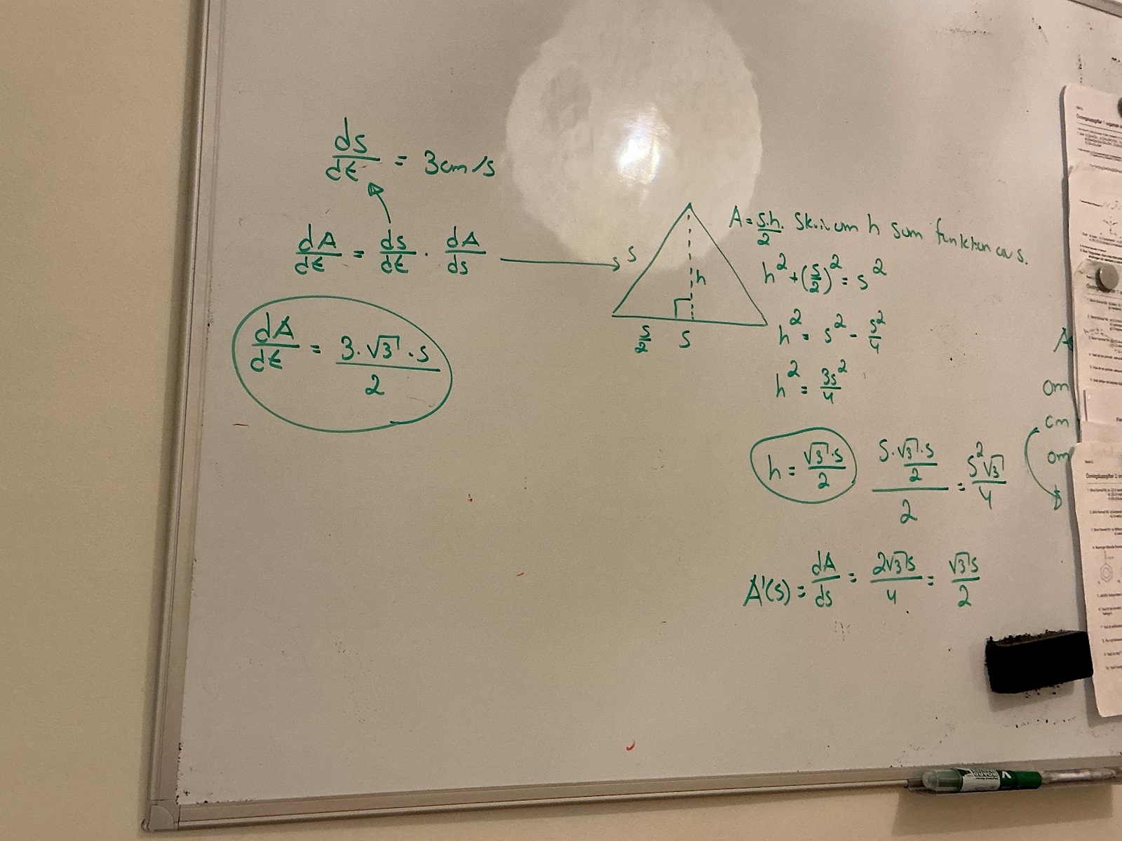 Sidan hos en liksidig triangel växer med den konstanta hastigheten 3 𝑐𝑚/𝑠. Ta fram en formel som ger hastigheten som arean ändras med vid tiden 𝑡.