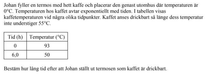 Bestäm hur lång tid efter att Johan ställt ut termosen som kaffet är drickbart