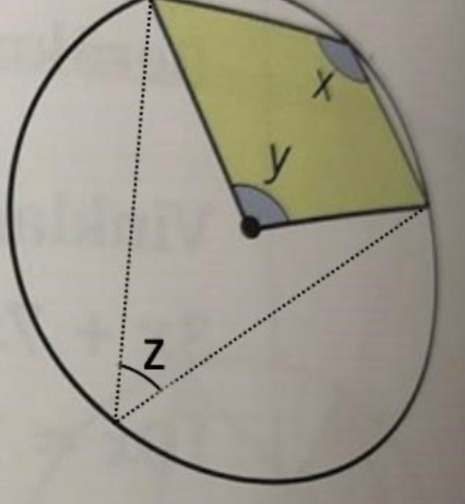 Vad kan man säga om vinkeln z? Jo, enligt randvinkelsatsen är y=2zy = 2z, eftersom y är medelpunktsvinkel till samma del av cirkeln som z är randvinkel till. Dessutom är z och x motstående vinklar i en inskriven fyrhörning, så z+x=180z+x = 180. De ekvationerna kan man kombinera för att få ut y=360-2xy = 360 - 2x.