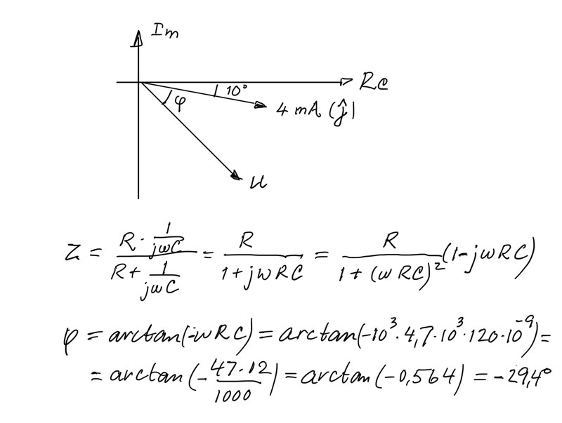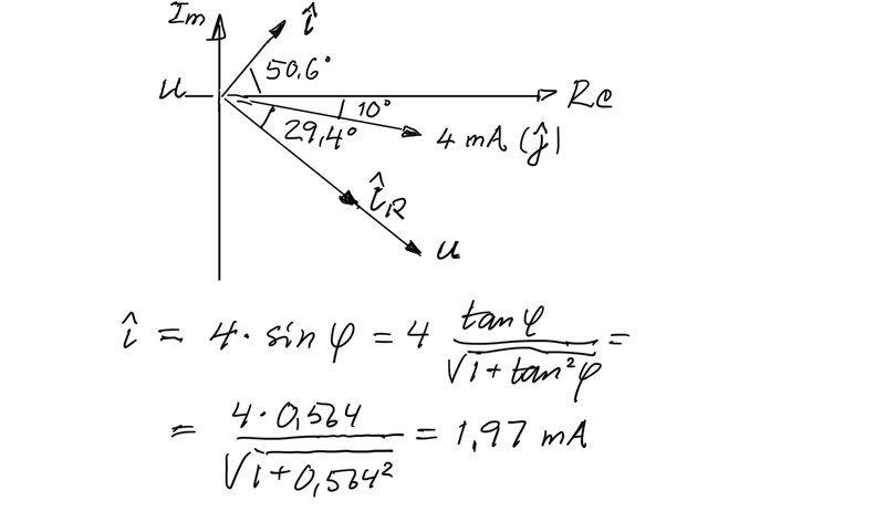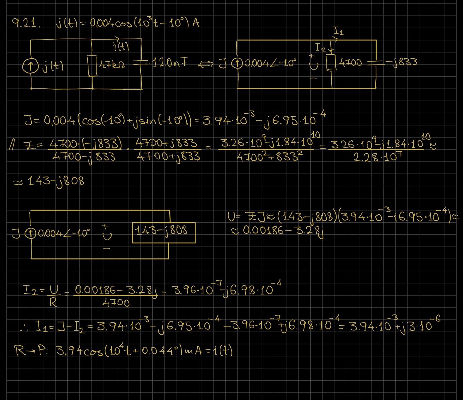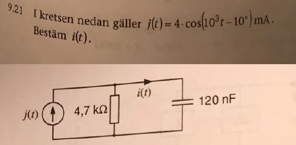 Den totala strömmen j(t) är känd och spänningen u(t) är densamma över strömkällan, motståndet och kondensatorn. Då det är en RC-krets ligger spänningen efter strömmen j(t).