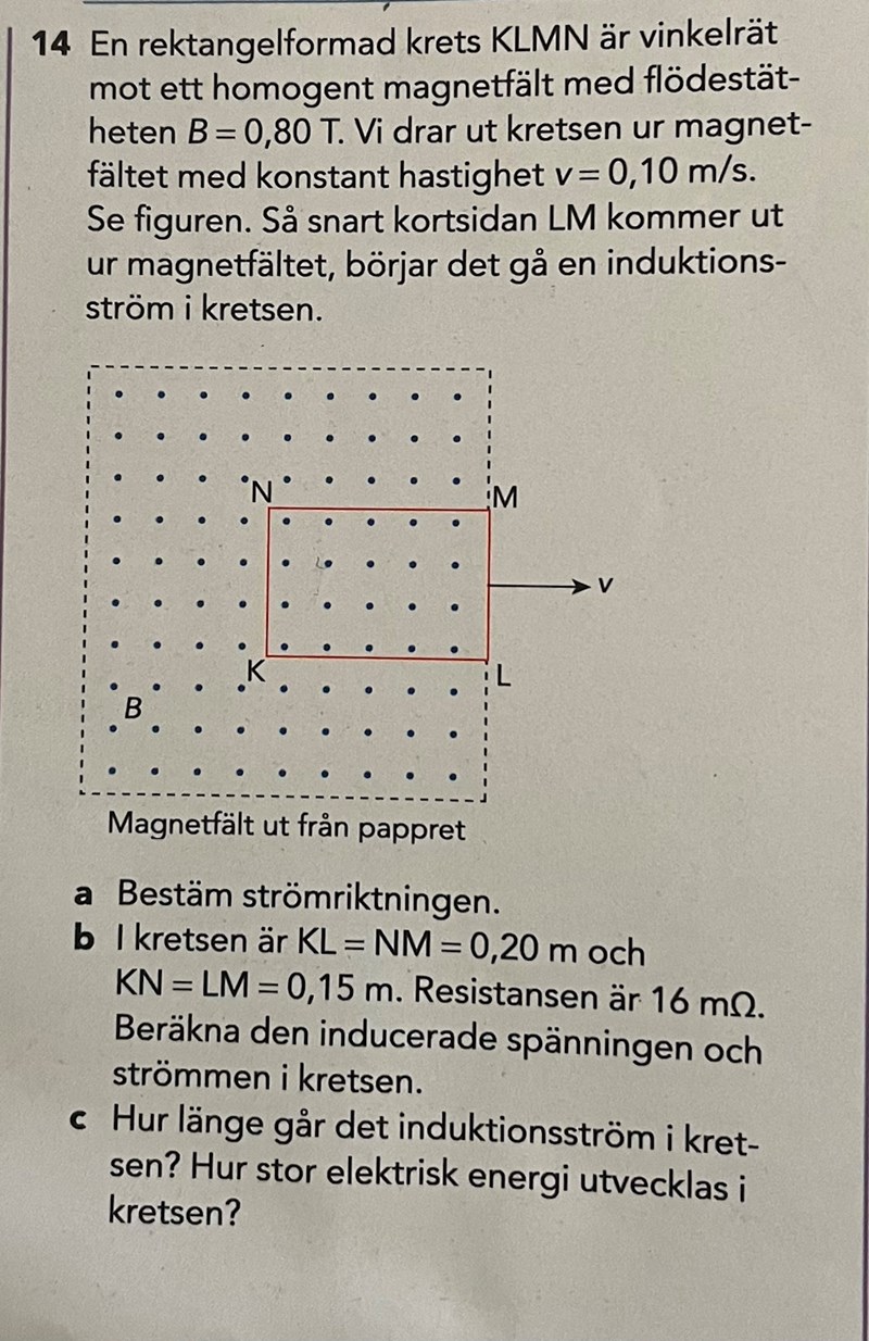 Jag håller på med uppgift 22 c) som du kan se nedan. För att lösa uppgiften behöver man även se uppgift 14 som jag också bifogar nedan. Jag undrar hur jag ska gå tillväga för att ta reda på induktionsströmmens riktning i kretsen? Jag förstår att jag ska använd amig av någon av högerreglerna på något sätt, men jag förstår inte riktigt hur.