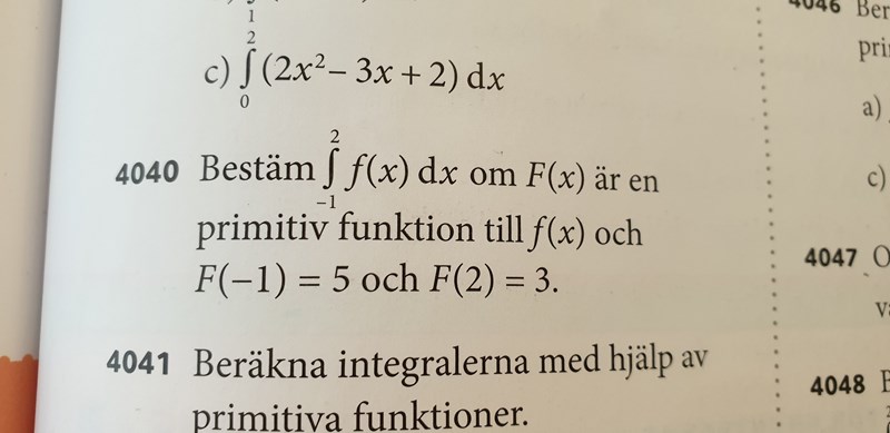 Jag förstår inte hur jag ska tänka på uppgift 4040, enda jag kan tänka på är att 5 -3 = 2 är egentligen när man satt in integralgränserna i den primitiva funktionen. Skulle någon kunna hjälpa mig?