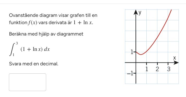 Talen 3 och 1 ska inte sättas in i , d.v.s. 3 och 1 ska inte sättas in i . De ska sättas in i dess primitiva funktion. Man behöver inte räkna ut den primitiva funktionen till (1+ln x) eftersom den redan är given via figuren.