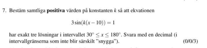 Hur ska jag ta mig vidare från detta? Jag har förstått att k i alla fall minst måste vara 2 för annars går det inte få fler än 2 lösningar då 360n / k kommer då ge 180 n. Jag har grafiskt sett att k varierar mellan 3.1 och 3.9 för att detta ska gälla, vilket då stämmer överens med mitt påstående. Men jag vill se det algebraiskt.