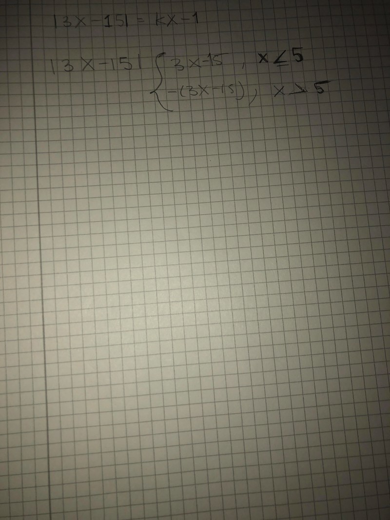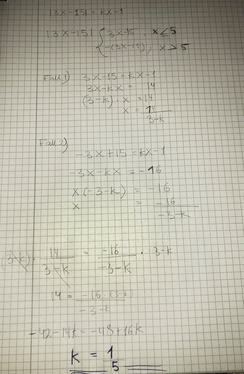 För vilka värden på k har ekvationen ∣∣3x−15∣∣=kx−1 endast en lösning?