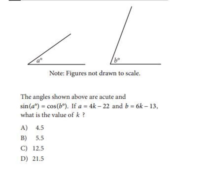 sin(a)=cos(90-a)=cos(b) vilket medför att 90-a=b. Ersätt nu a och b med de givna uttrycken och lös ut k.