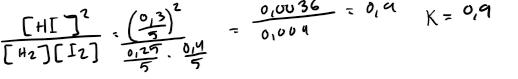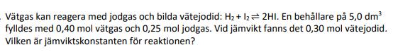 Från början fanns det 0,40 mol vätgas, 0,25 mol jodgas och 0 mol vätejodid. En del av vätgasen reagerar med en del av jodgasen, så att det förbrukas vätgas och jodgas samtidigt som det bildas vätejodid. Hur mycket vätgas och jodgas har förbrukats när det har bildats 0,30 mol vätejodid? Hur många mol vätgas respektive jodgas finns det kvar?
