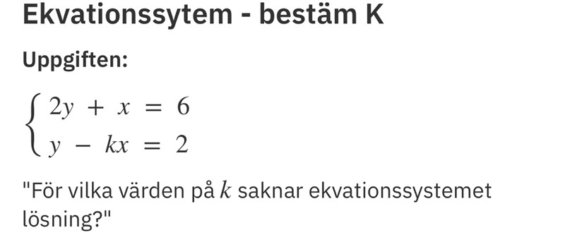 för att 2 linjer ska sakna lösning måste k1=k2 men m värden ska vara olika.