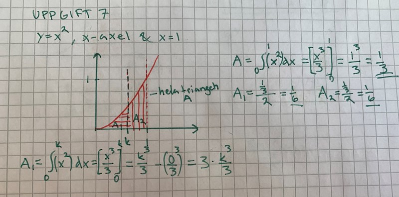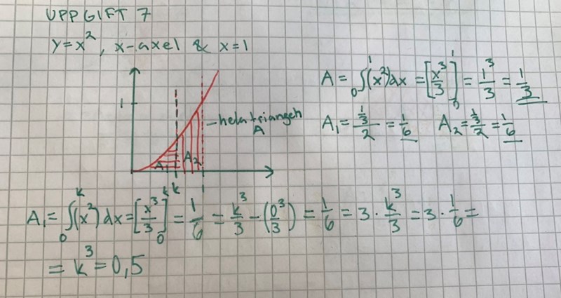 Uppgiften: ett område begränsas av kurvan y=x^2, x-axeln och linjen x=1. Bestäm k, så att linjen x=k delar området i två lika stora delar.