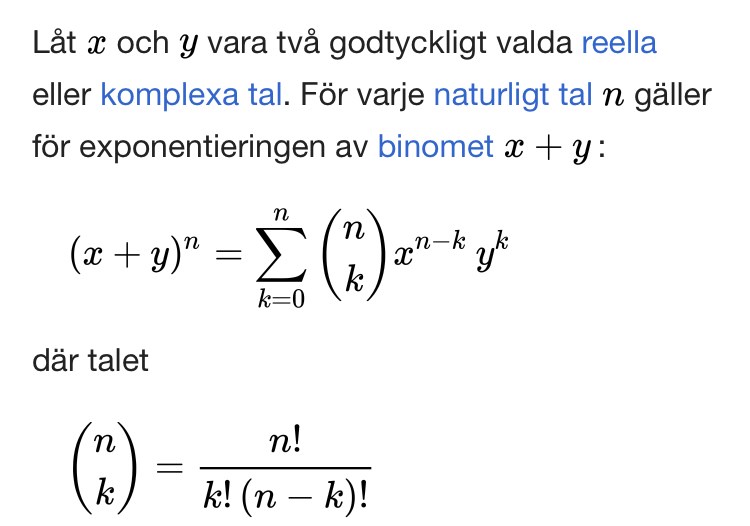 Jag tyckte att var svår att hantera och skrev inte om den termen till , vilket jag förstås borde ha gjort. Jag var också osäker på vilken term som ska ha exponenten k och vilken term som ska ha exponenten 30-k.